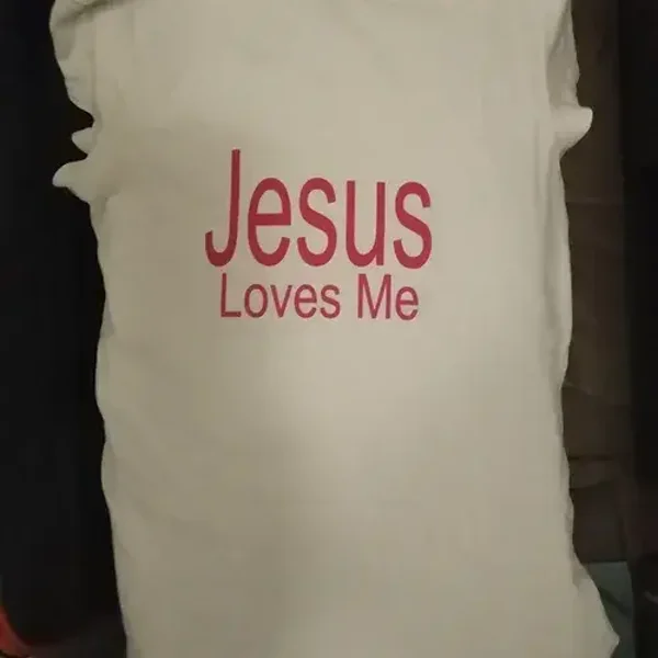 T-shirt blanc e190 avec impression de plusieurs couleurs. Avec impression "Jesus Loves Me" sur la torse