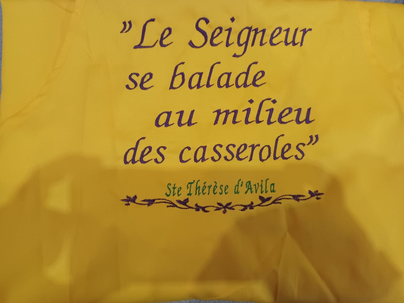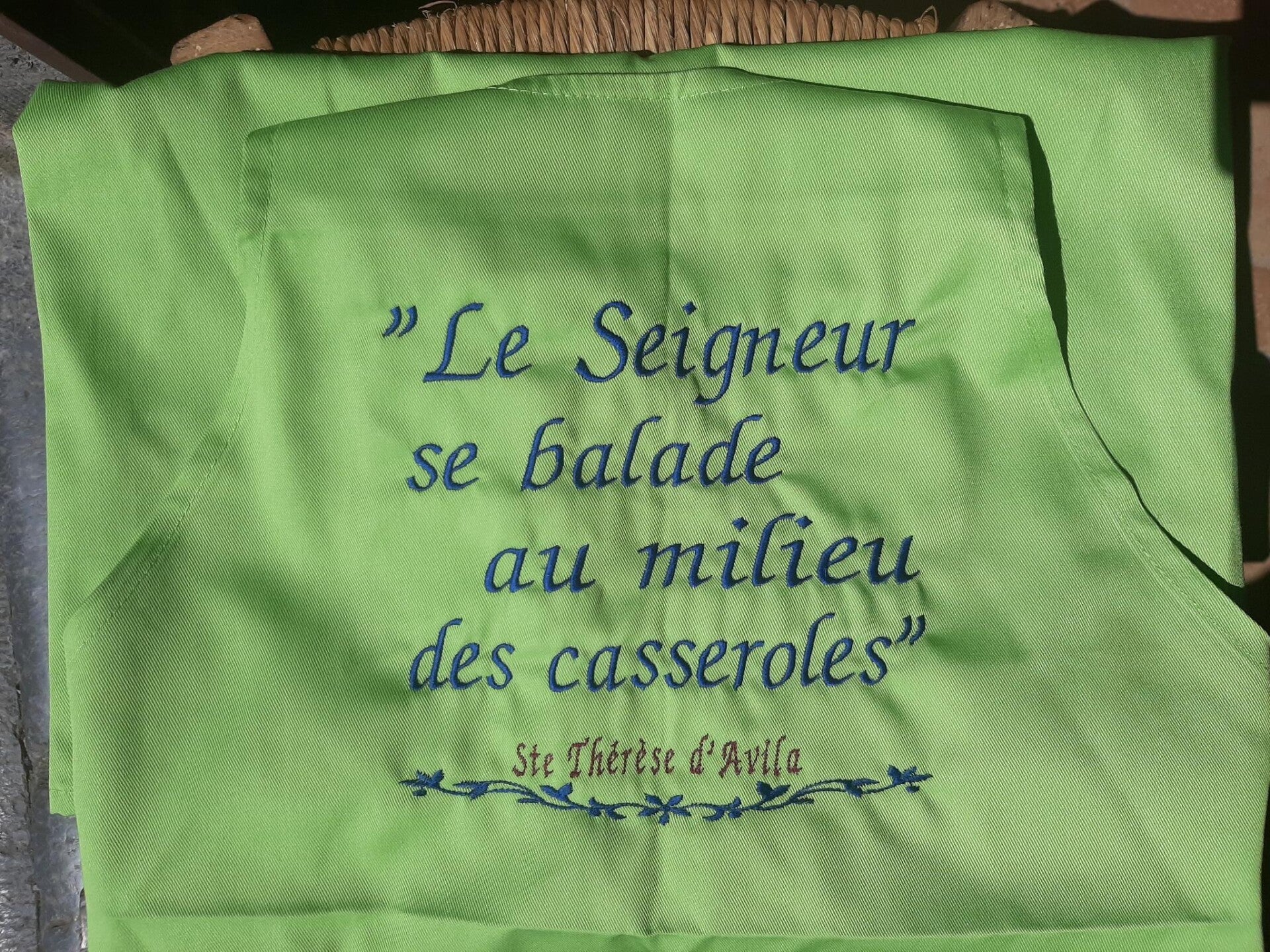 Tablier sans posche de marque Kariban avec broderie: parole ste Thérèse d'Avila sur la poitrine